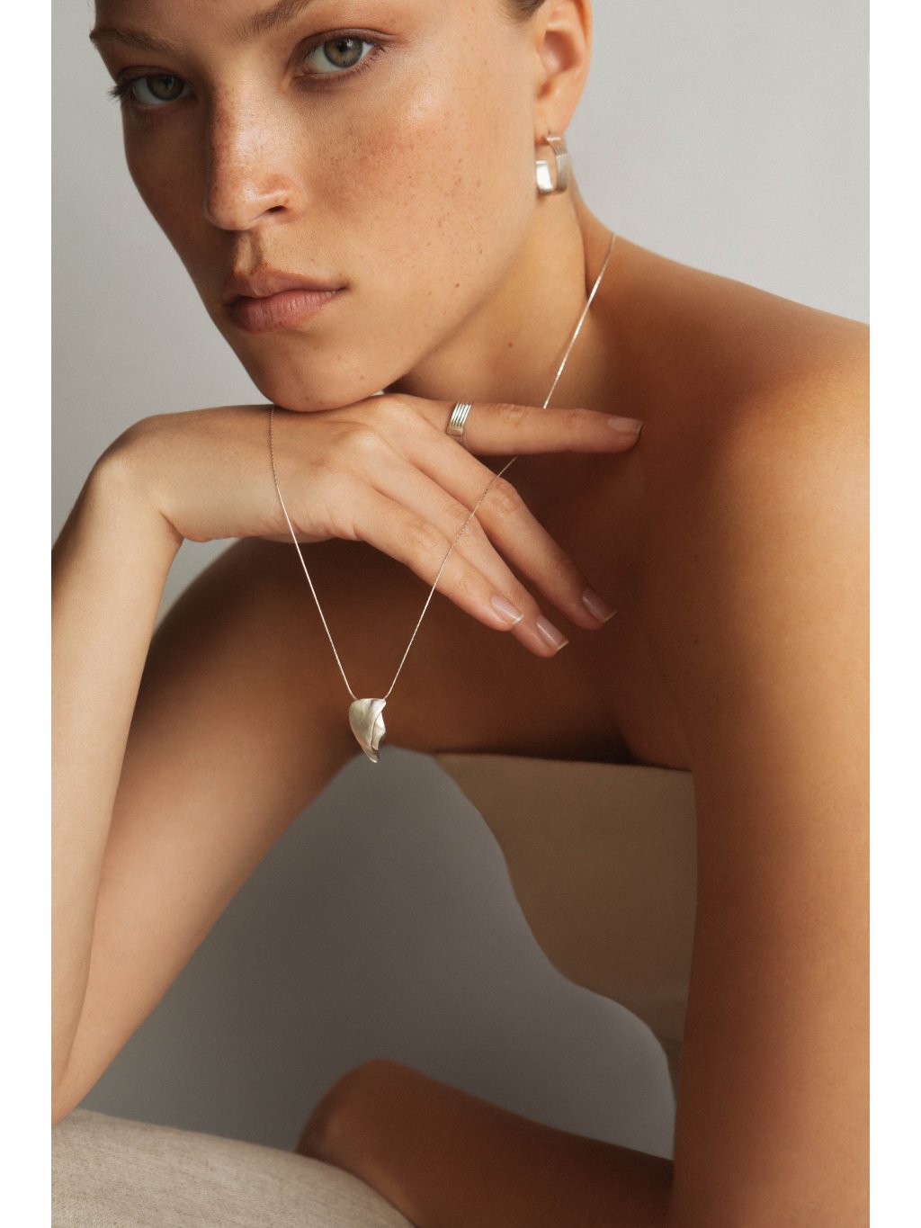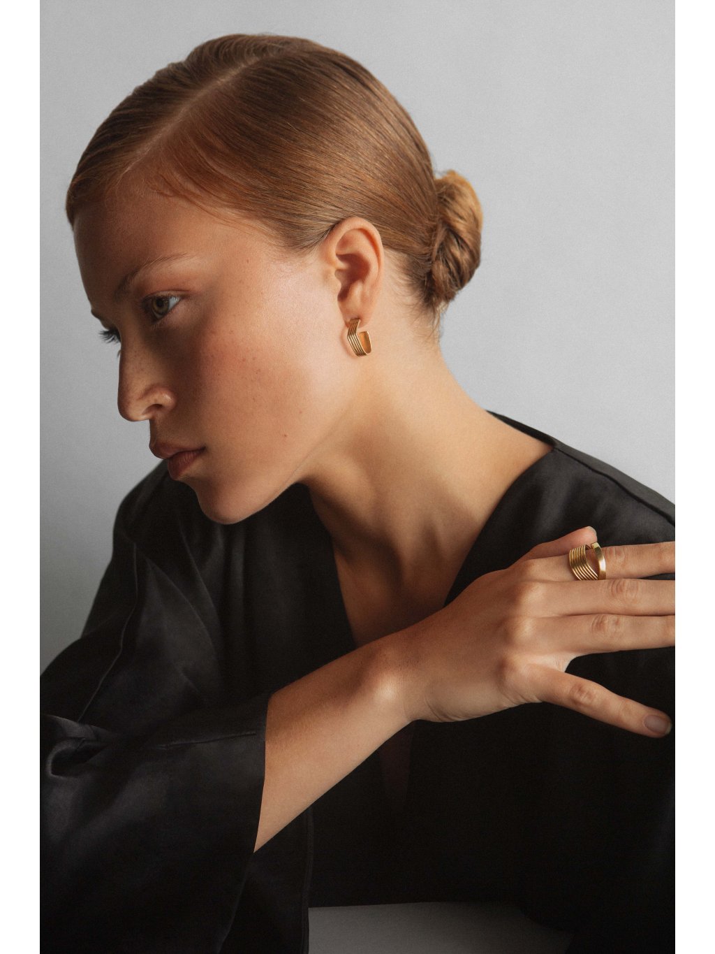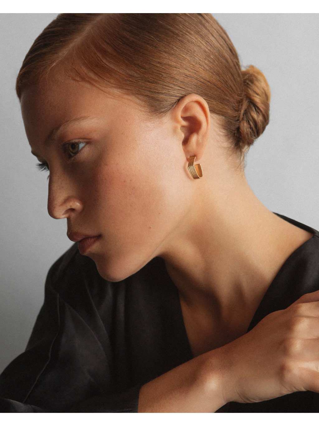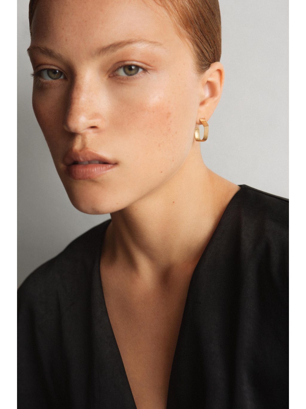 N Earrings are medium-sized silver hoops featuring a distinctive texture and an elegant geometric shape.
