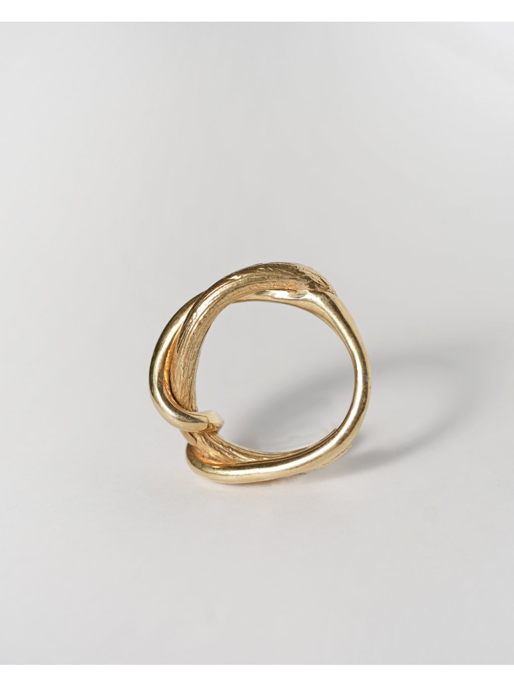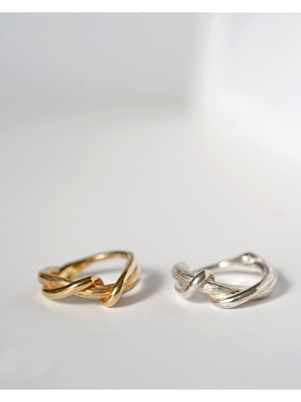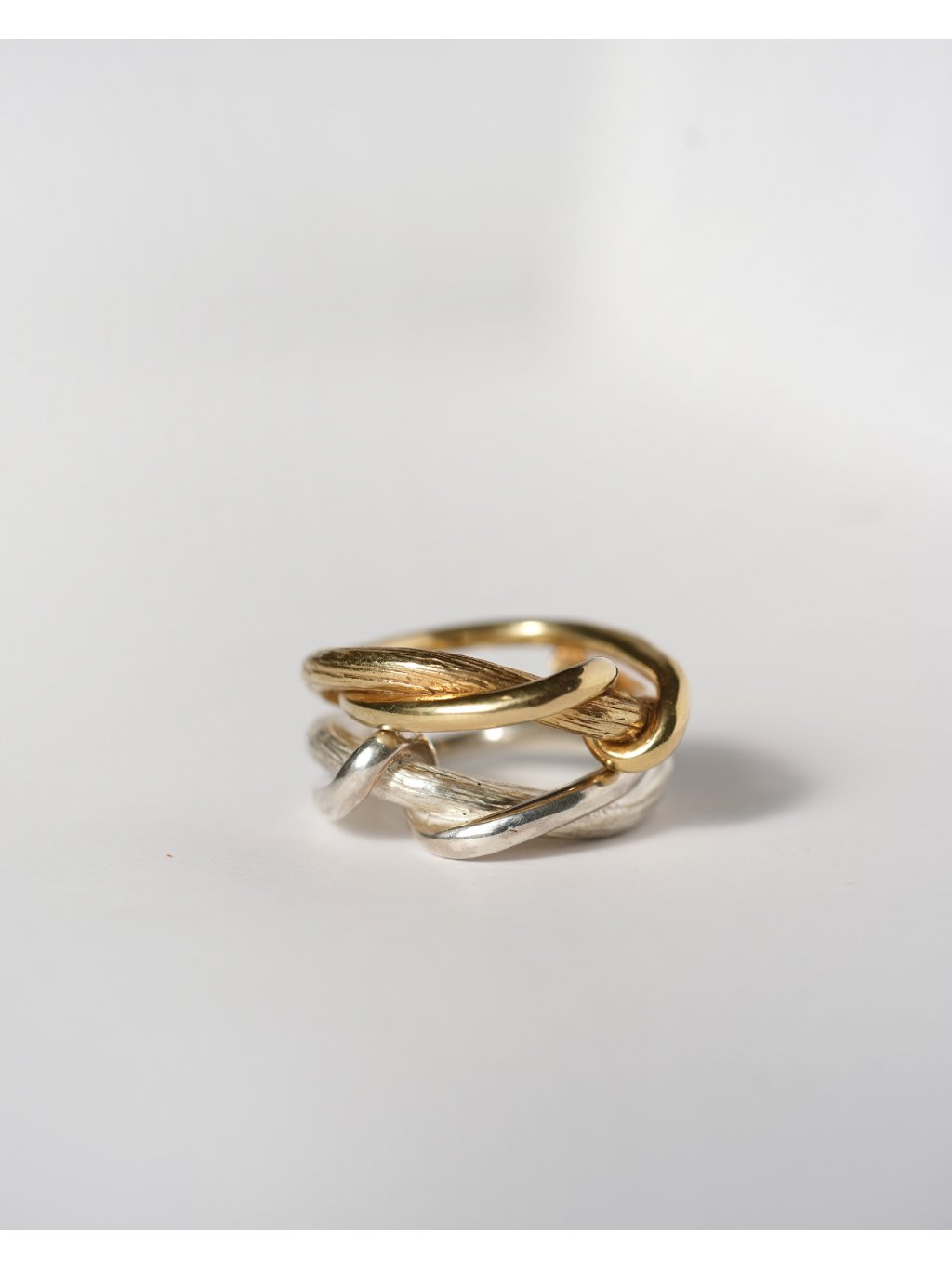 Stříbrný prsten Vaal tvoří dva provázané kruhy. Kolem prvního, s drsnou texturou, inspirovanou přírodou, se vine hladká, lesklá smyčka.